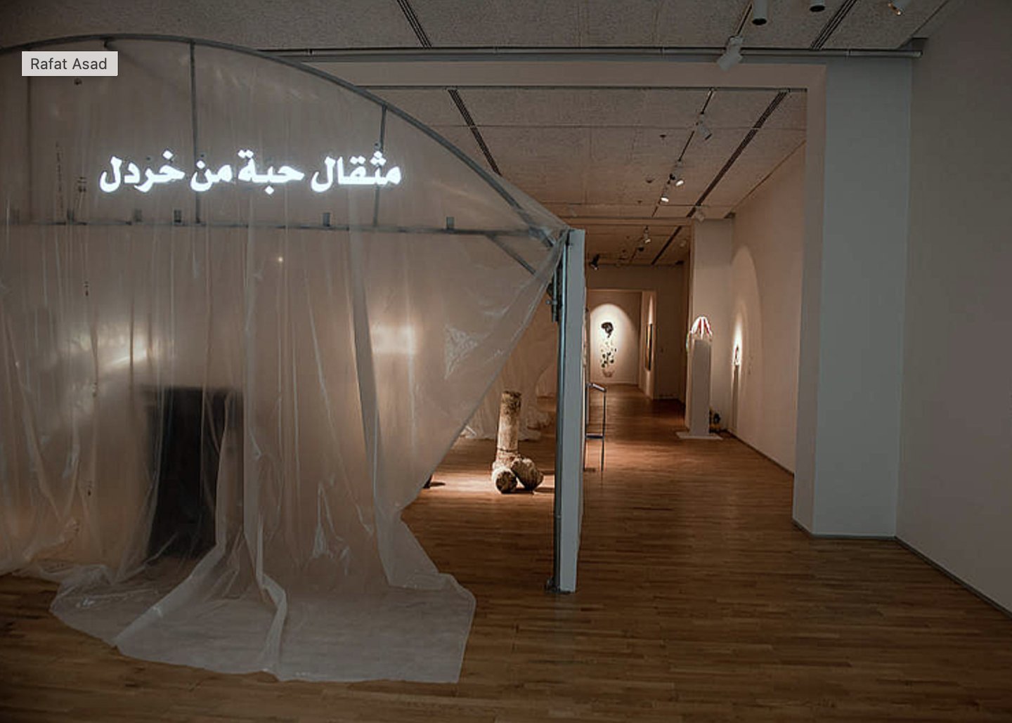 This artwork is a lighted sign with the phrase Weight of a grain of mustard. This piece serves to highlight the importance and effectiveness of the seeds: in spite of human efforts to destroy it, it is always able to grow again.