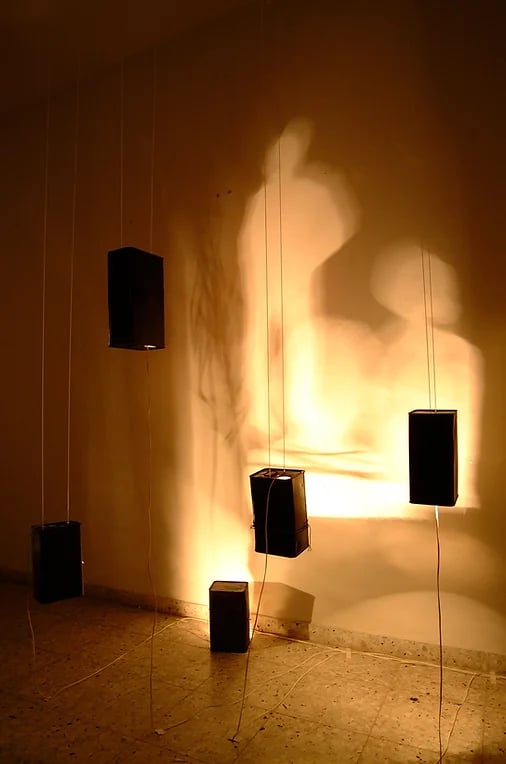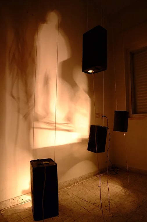 I fixed the boxes to the ceiling using fibers in different lengths, distance between the boxes and the wall was different in order to control the size of the shadow, as I already mentioned, these five boxes together in addition to their shapes formed my art work that represents in deed the absent in the life of each one of us.