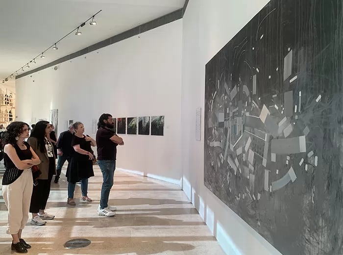 The artist also addresses the issue of temporary architecture and reconstruction and questions how the occupation transforms cement from a material that builds and protects to one that kills. He also reviews the forms of Gaza’s isolation from the world through paintings and poetic texts born from the womb of the tragedy.